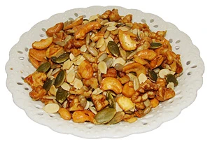 五種堅果仁:蜜核桃、蜜腰果、南瓜子、蜜葵瓜子、瓜子仁。 堅果類含有多種氨基酸,是一種優質的植物蛋白質來源。 維生素E是最有效的抗生氧化劑。 含有鋅、鉀和硒等微量